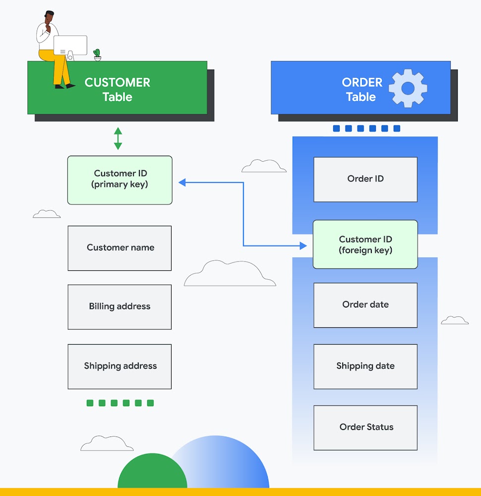- 외래 키(foreign key): 다른 테이블에서 단일 행을 식별하는 데 사용할 수 있는 하나 이상의 열